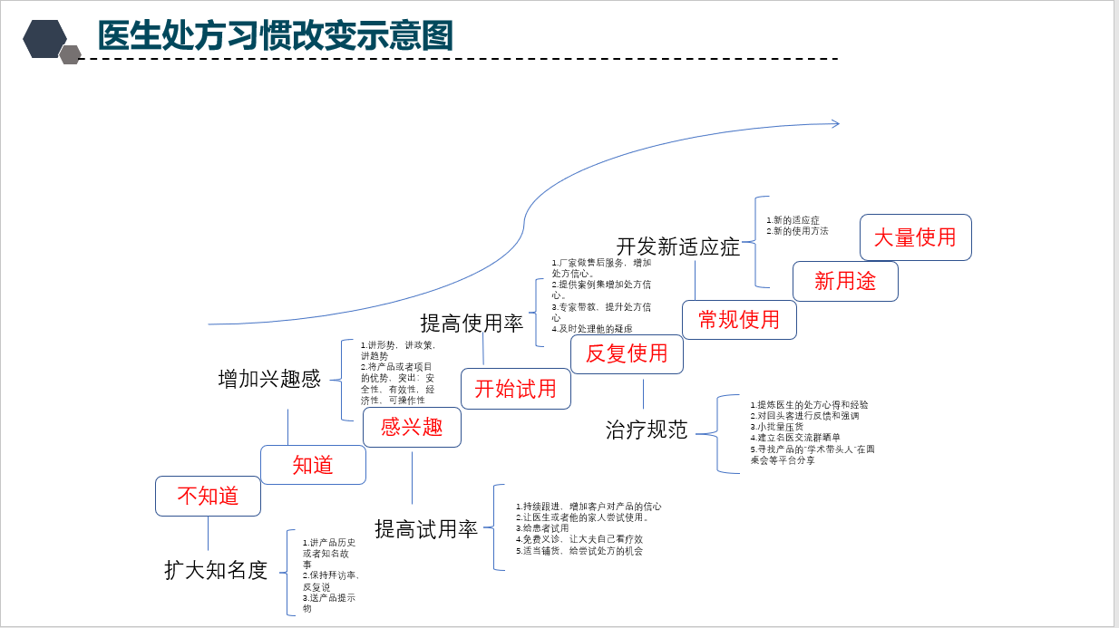 我们一定要结合自己产品或者技术的特殊情况,结合医生处方习惯变化的推进图,在每个不同的时期做一些针对性工作,来为产品或者技术的最终上量做铺垫。