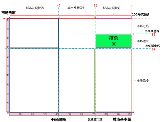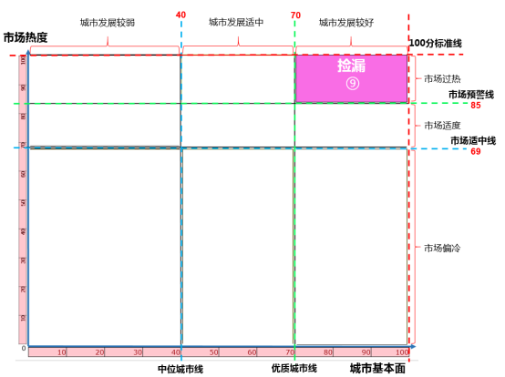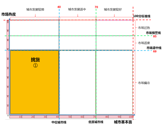 九宫格一至三区均处在城市发展较弱区,根据市场热度从低到高重新定义九宫格一至三区策略。