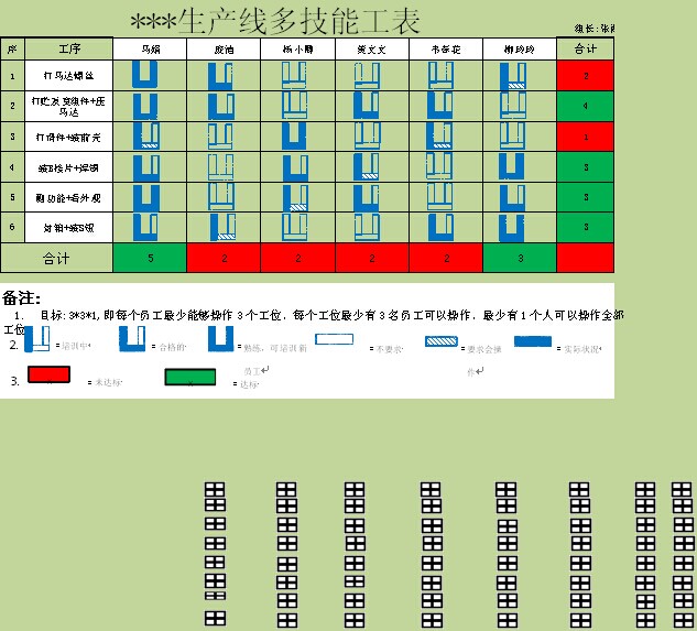 从员工技能表中我们可以看到,这条生产线的要求是3*3*1,即每个员工最少会操作3个工位,每个工位最少有3名员工可以操作,最少有1个人可以操作全部工位,确保整个生产线可以正常运行。但是其中标示红色部分,分别表示某个工位,或者某个人的技能并没有达到要求,这给我们下一步的培训计划提供了基础的信息支持。