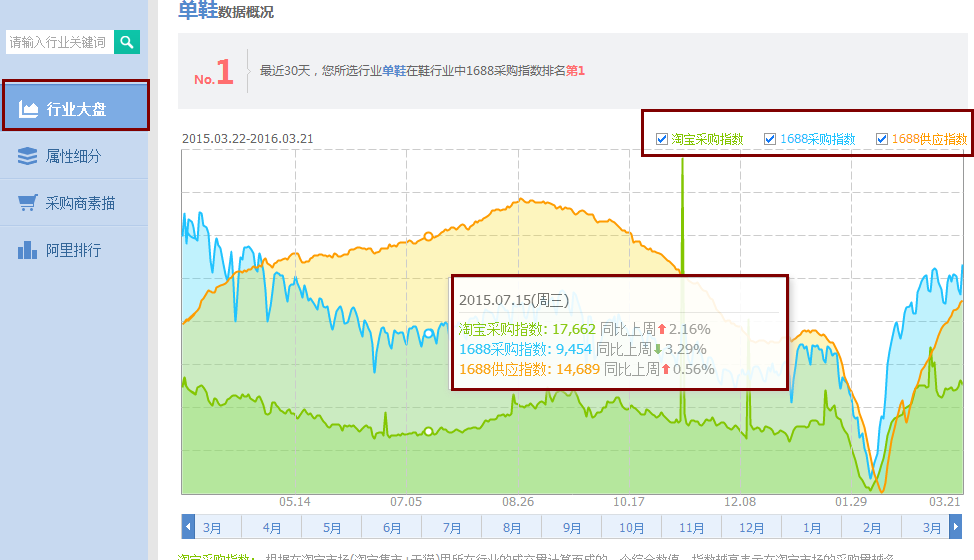 看大盘主要是看数据,这里的数据是指一年内自己所属产品的销量走势及淡旺季指数。