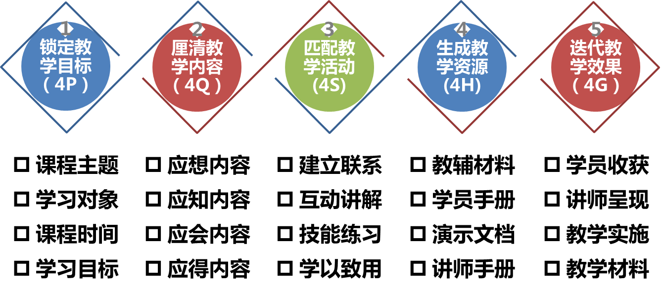 第五步,迭代教学效果。将教学资源进行应用,属于教学实施的范畴,回答“效果呢”的问题。教学效果要实现4个方面均好,简称4G(Good),分别为G1学员收获、G2讲师呈现、G3教学实施和G4教学材料。