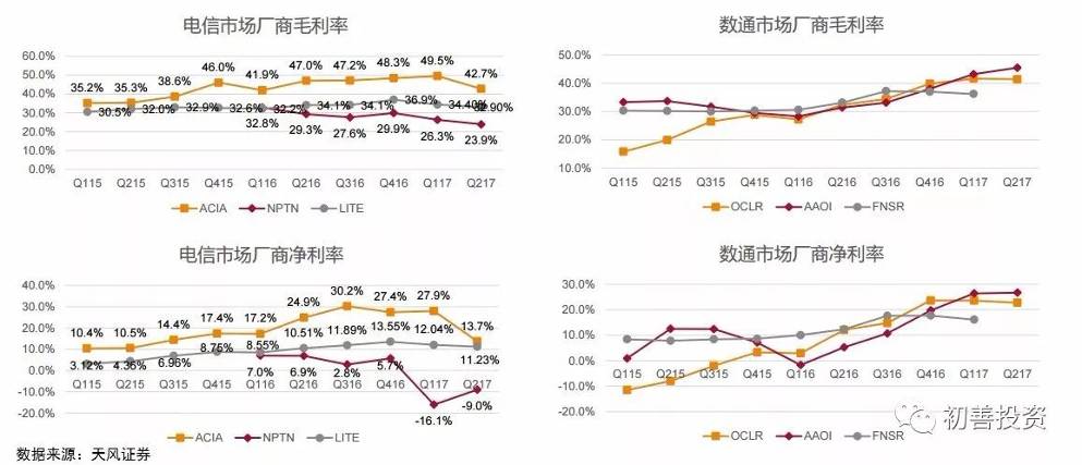 以电信市场为主的Acacia、NeoPhotonics、Lumentu和以数通市场为主的AppliedOptoelectronics(AOI)、Finisar、Oclaro对比可以发现,数通市场公司的毛利率从2015年之后一路走高,净利率在20%左右,电信市场从2016年出现毛利率下滑趋势,净利率在10%左右,明显低于数通市场。如图6-31所示。