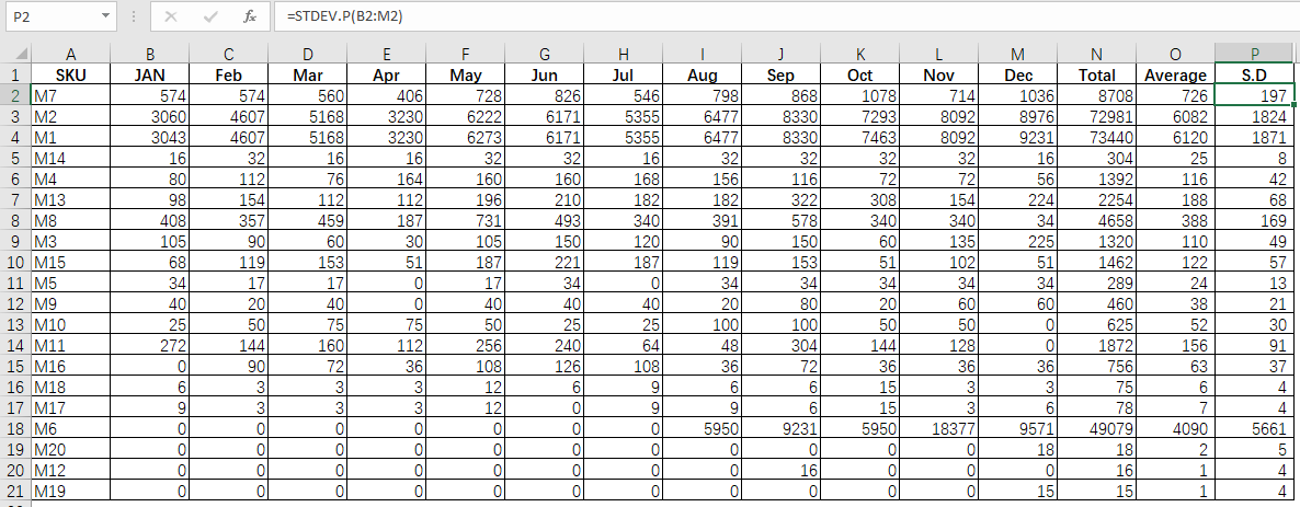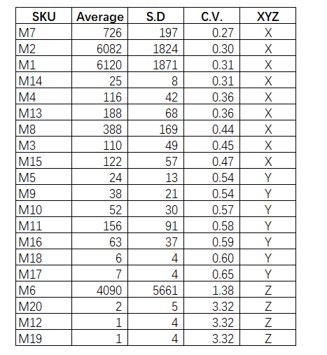 同样,某公司对20个SKU进行ABC分类之后,希望继续对此进行XYZ分类。那么列出其过往12个月的需求数据,并对此计算出平均值(Average)和标准差(Standard Deviation,简称S.D.)。标准差数值越高,代表着该序列越不稳定。