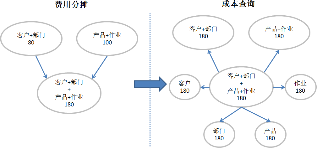 同样是进行多维分析,多维组合成本与商务智能项目有着质与量的双重区别。从数据的角度可以看到,多维组合成本不是简单的数据搬家,不是简单的将分散查询转化为集中查询,不是简单的将平面二维查询转化为立体多维查询,而是通过分摊模型,让原本孤立的数据面向应用关联,让原本静止的数据基于规则流动,在关联中聚合,在流动中碰撞,在聚合与碰撞中裂变,在裂变中产生多维组合的海量数据,进而丰富数据资产。