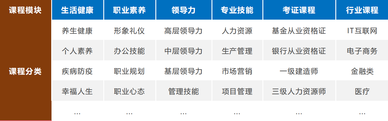 还有一种是标准课,就是放到哪个企业都通用的。以深圳市新风向科技有限公司为例,新风向科技作为企业培训精品课件供应商,多年以来根据企业的实际需求情况,基于岗位胜任力模型构建课程体系,已重点开发了5000+门精品课程。课程类别重点围绕职业素养、管理技能、专业技能三大通用能力素质,并结合不同行业进行拓展,覆盖各行业各职业岗位上百个系列课程,满足不同培训场景的需求。如表11-2所示。