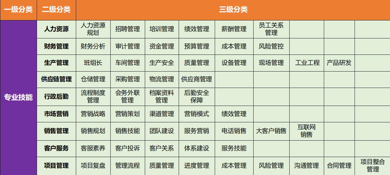 以“专业技能”这一模块为例,专业技能下涵盖人力资源、财务管理等九大二级分类,其中每个分类下又细分出众多板块,即为三级分类。如表11-3所示。