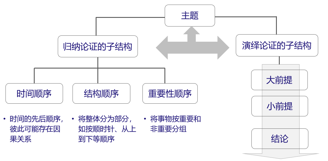 归纳式思维重在归纳,各要素之间存在共性。比如,华南市场销售额下降20%,华东市场销售额下降25%,华北市场销售额下降40%,这三个句子存在一个“市场销售额”的共性,可以作为“公司几大市场的销售面临问题”的论据。其中,归纳式思维又细分为3种表现顺序:时间顺序,空间顺序,重要性顺序。