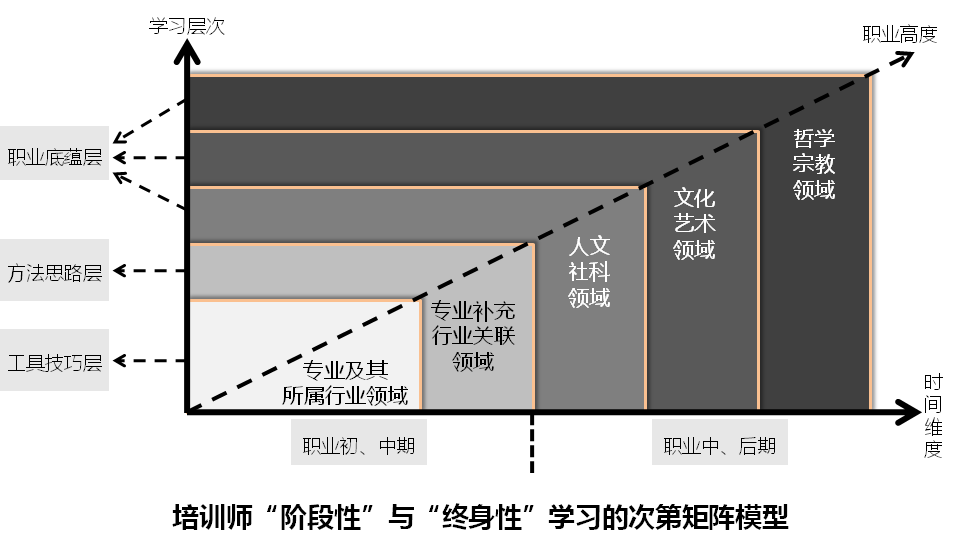 所以,“终身性”学习除了需要时间、方法等维度的考量之外,还有两个改善和提升学习效果的重要因素,即“学习层次”与“职业高度”。为此,笔者专门建构了一个培训师“阶段性”与“终身性”学习的次第矩阵模型(如图5-1)。