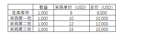 某公司原有在库库存1000件,其采购单价是8美元,后续分开陆续购入了三批,而三批的采购价格分别是10美元,12美元,15美元。