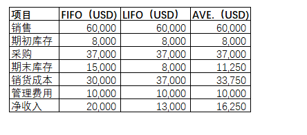 销货成本: 在LIFO的情况下,最先出售的是最后进来的库存,也就是单价为15美元的第三批采购,因此卖出了3000件的情况下,销货成本就是15,000+12,000+10,000=37,000美元了。而在FIFO的情况下,则是相反,先把最早的库存出售了,也就是初始的8,000美元的库存开始先销售,所以销货成本是8,000+10,000+12,000=30,000美元。至于平均成本就根据所有库存的平均单价来计算售货价值,也就是(8,000+10,000+12,000+15,000/4)*3,000=33,750美元。
