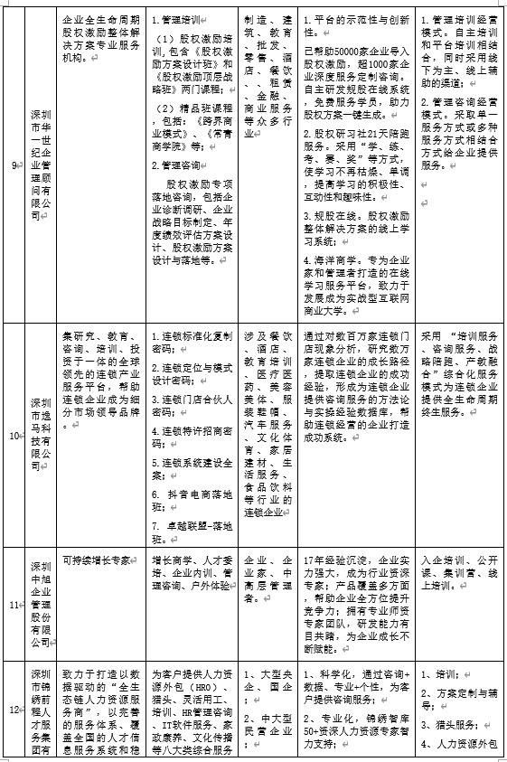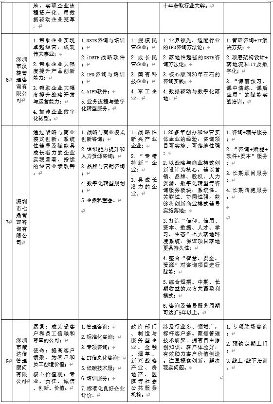 以深圳市为代表的大湾区管理咨询行业的各类企业基本上涵盖了上述管理咨询服务的范围,为充分展示大湾区管理咨询公司的风貌,我们根据管理咨询公司不同的服务产品、服务对象、服务模式以及企业的规模、历史、核心竞争力等因素,筛选出12家典型企业,同时加上具有代表性的典型咨询机构“上海天强管理咨询有限公司”和“北京和君集团有限公司”,对他们的业务范围与专业能力等概况进行介绍。