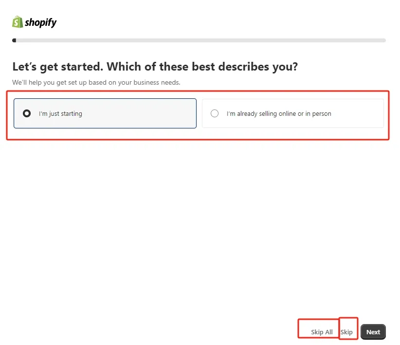 首先,访问Shopify官网注册账户并开始免费试用(如下图所示)。在输入一些基本的业务信息并选择销售区域后,创建你的Shopify ID,即可进入商店主页。