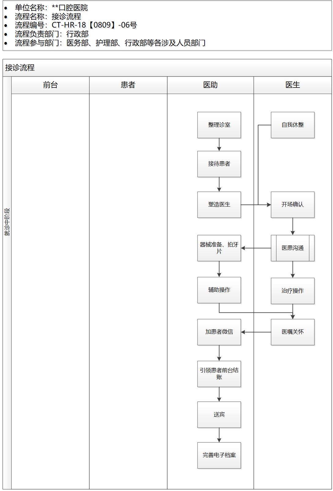 患者在见到医生之前,经过前台的一番塑造,对医生充满了期待,希望医生是专业认真、精神饱满的。医助在整理诊室的同时医生进行片刻的自我休整,把每个患者的接待过程都当作是一次全新的开始,医生每天不断地接待患者,每接待一个患者都要从上一个患者的治疗和沟通中走出来,医生可以走出诊室进行身体活动调整状态,整理仪容仪表,有个小小的重新进入诊室的仪式感。